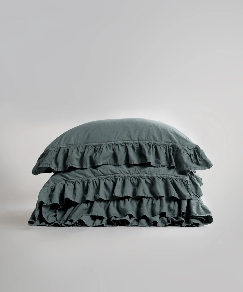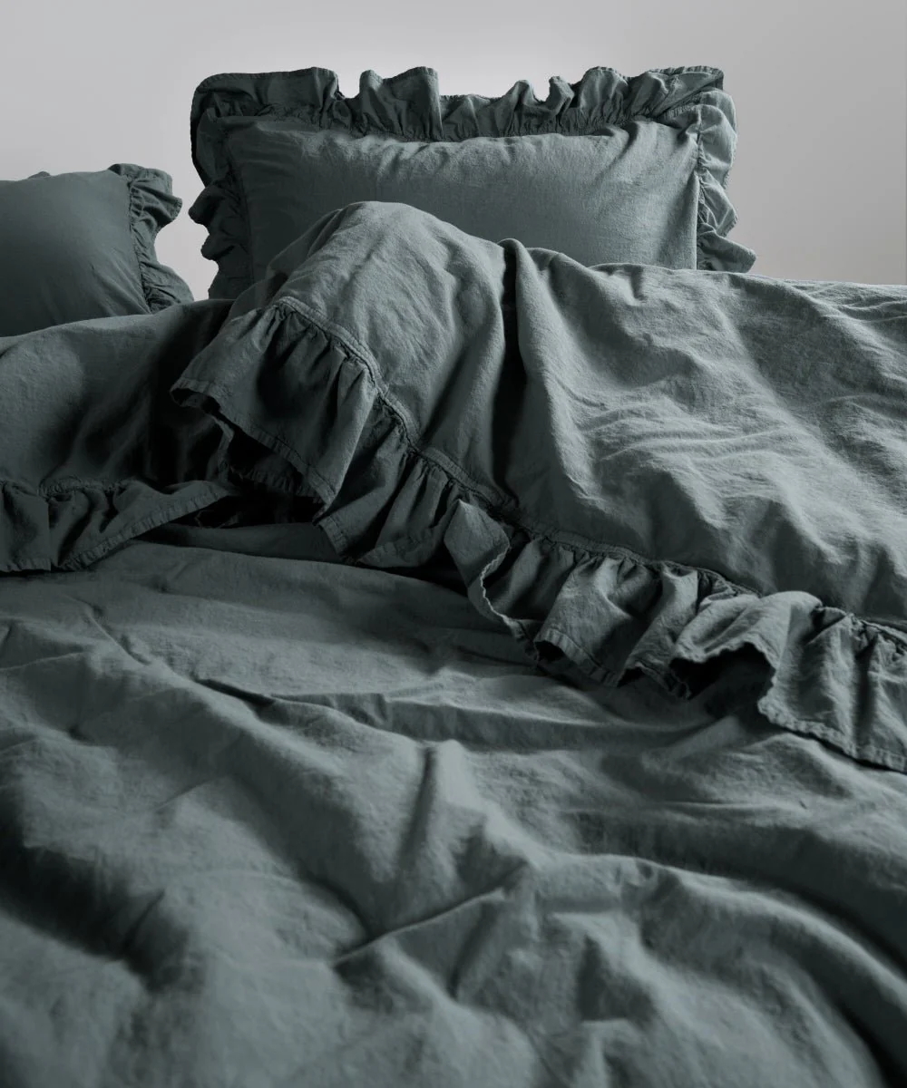 Ексклюзивна постільна білизна з міцного, зносостійкого матеріалу, яка має сертифікат Oeko-Tex® 100. У цьому комплекті тканина м'яка, міцна, не деформується, не сідає, не линяє і не вимагає прасування завдяки методу обробки Stonewash. Комплект однонотонний з пом'ятим ефектом, який надає затишку, комфорту, розслабленості при відпочинку, декорований рюшами на підковдрі та наволочках, застібка на ґудзиках, підходить для зими та літа.