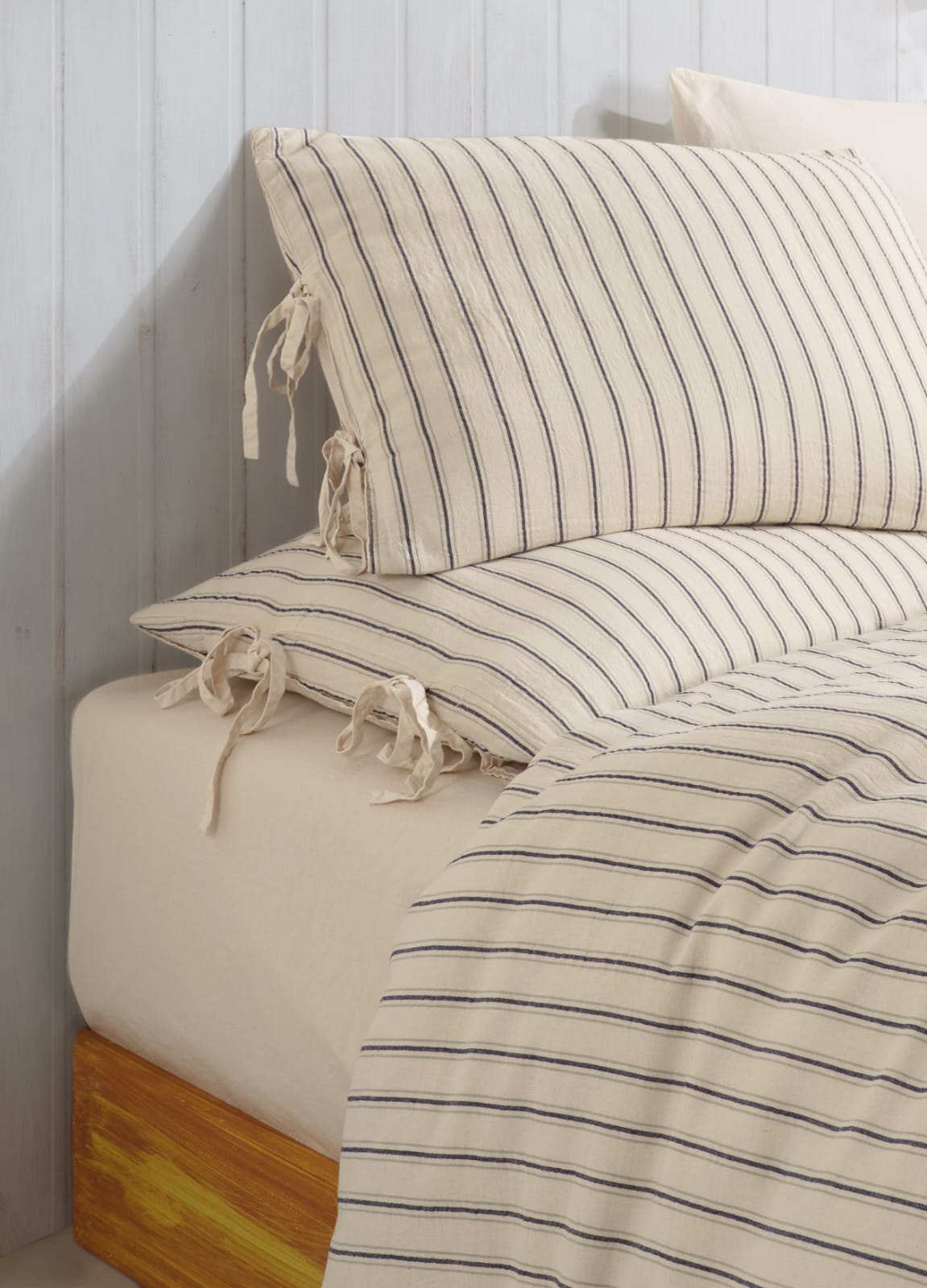 Постільна білизна з міцного, зносостійкого матеріалу, яка має сертифікат Oeko-Tex® 100. У цьому комплекті тканина м'яка, міцна, не деформується, не сідає, не линяє і не вимагає прасування завдяки методу обробки Stonewash. Комплект декорований смужками з пом'ятим ефектом, який надає затишку, комфорту, розслабленості при відпочинку, застібка на ґудзиках, підходить для зими та літа.